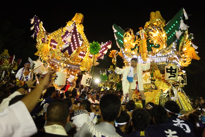 日も暮れ練り出を行います 2015年 撮影 練り出を行い、屋台を差し上げます 練り場中央へ移動し、他町屋台の練り出しを待ちます 伊保中部、曽根東之町と練り合わせを行います 練り合わせを終え、東門より宮出しを行い、曽根総合市場へ向かいます 映像(2015年)