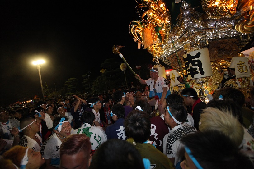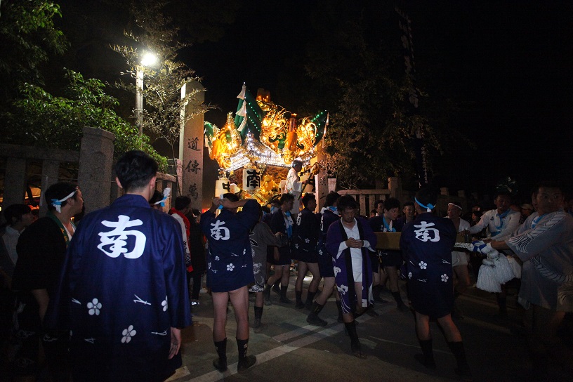 日も暮れ練り出を行います 2015年 撮影 練り出を行い、屋台を差し上げます 練り場中央へ移動し、他町屋台の練り出しを待ちます 伊保中部、曽根東之町と練り合わせを行います 練り合わせを終え、東門より宮出しを行い、曽根総合市場へ向かいます 映像(2015年)