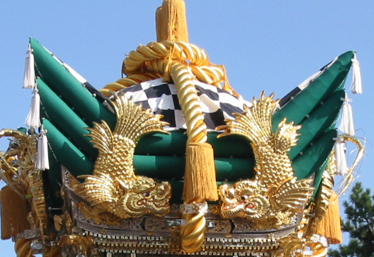 梵天は布団の屋根に取り付けられた錺金具のことをいいます。「うっとり彫り」の海老・鯱の梵天は黄金に輝き、秋空に映えます。播州の錺師の間で伝えられているのが「うっとり彫り」。タガネと金槌だけで、ふっくらと立体的に浮き出し、緻密な模様を彫りこむ技術です。 新調屋台(白木)時に取り付けられた梵天 漆塗屋台に取り付けられた梵天