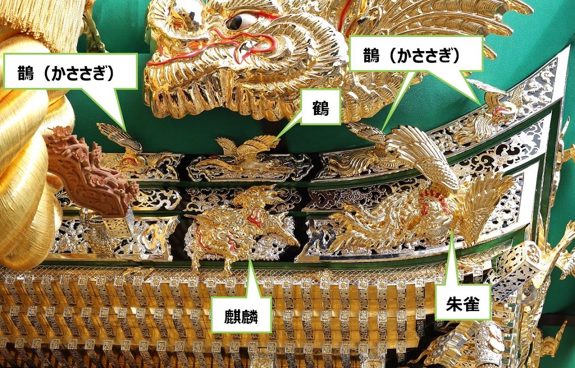 朱雀・麒麟・鵲(かささぎ)・鶴の置き金具を配置しています