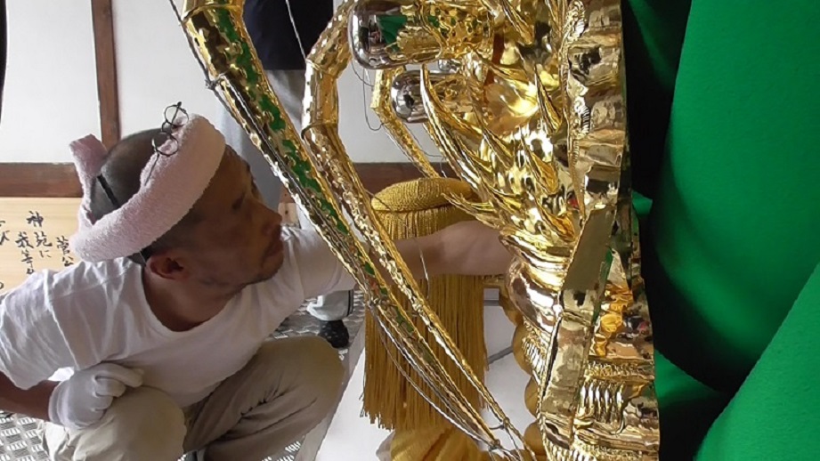 「錺師:かざり金具きたかど様」、「ふとん下地師:大和建築様」 協力のもと梵天の取り付けを実施しました。