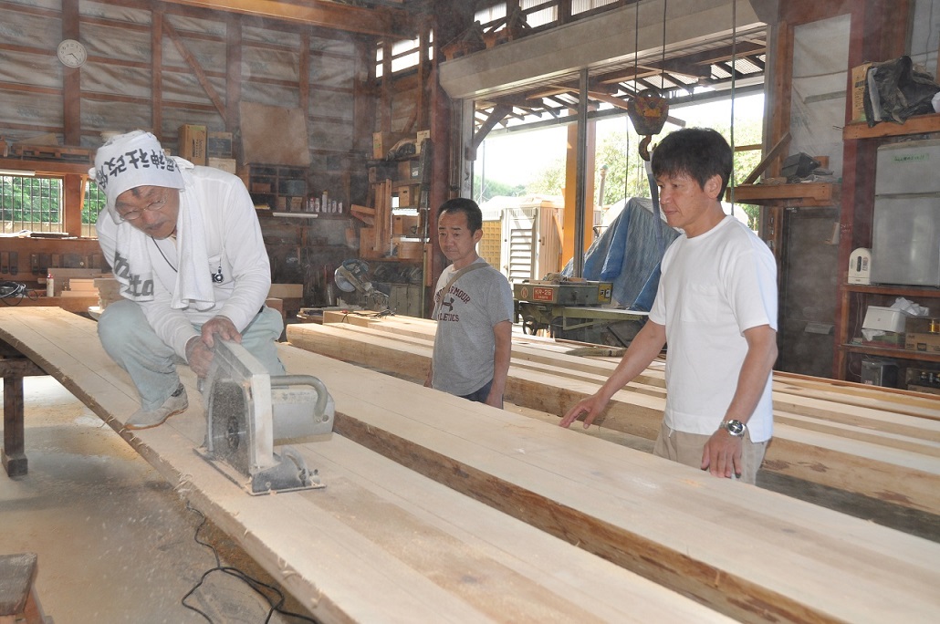 2017年4月17日 34年ぶりの南之町屋台新調制作が福喜建設株式会社において、棟梁福田幸義さんを中心に始まりました。
