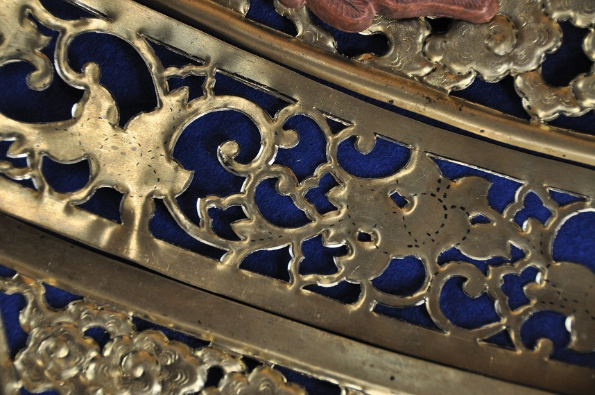 水切部分は、打ちだし透かし金具(上裏甲・水切、雲・桐文様)、平打ち透かし金具(下裏甲・茅負、唐花唐草紋様)などに